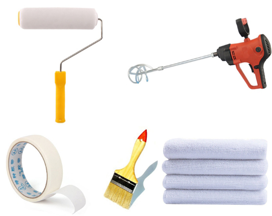 一、施工工具的准备 1.9寸的优质短毛滚筒和4寸的优质短毛滚筒各一把。 2.手提电动搅拌器(如没有可用干净的长条木棍替代)。 3.美纹纸等防护用品若干。 4.刷子、抹布等清扫用具。